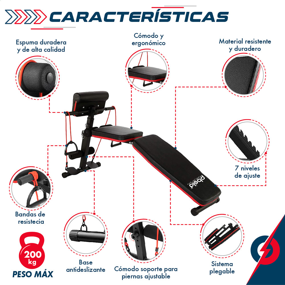 Ajuste versátil: Con múltiples posiciones de ajuste, puedes elegir entre plano, inclinado o declinado, ofreciendo la flexibilidad que necesitas para trabajar diferentes grupos musculares.